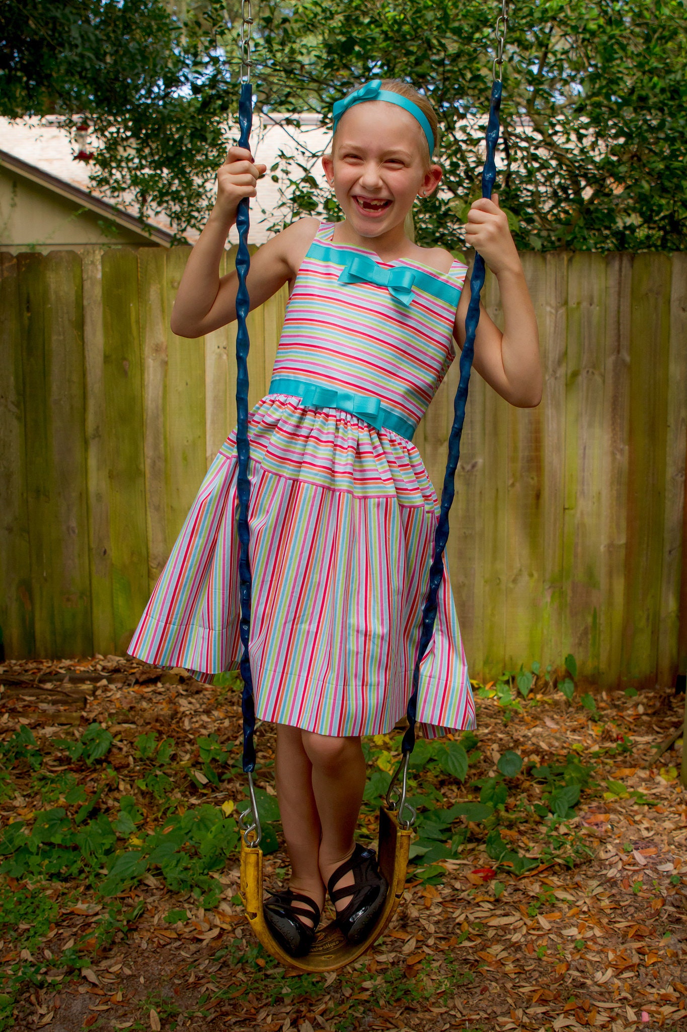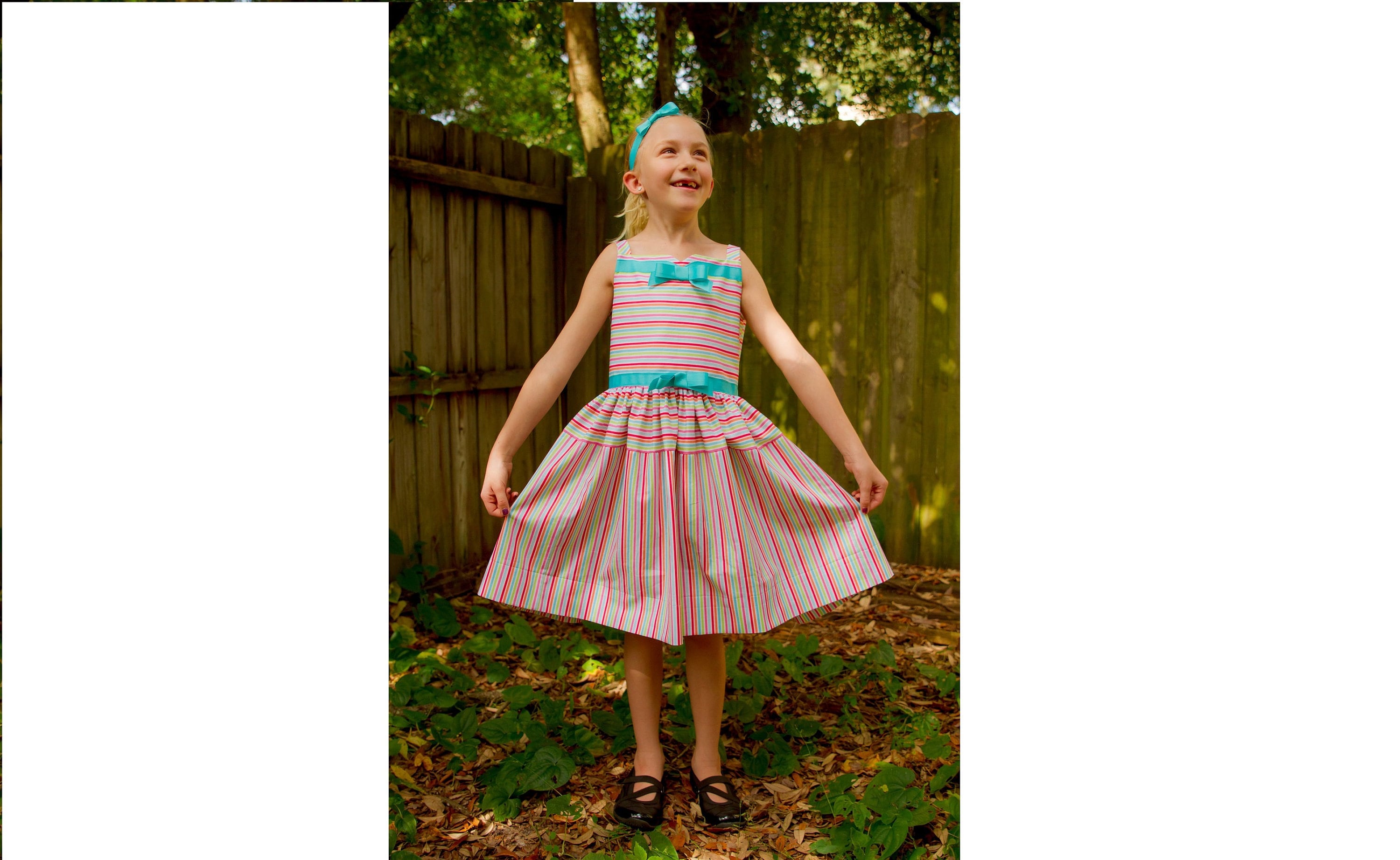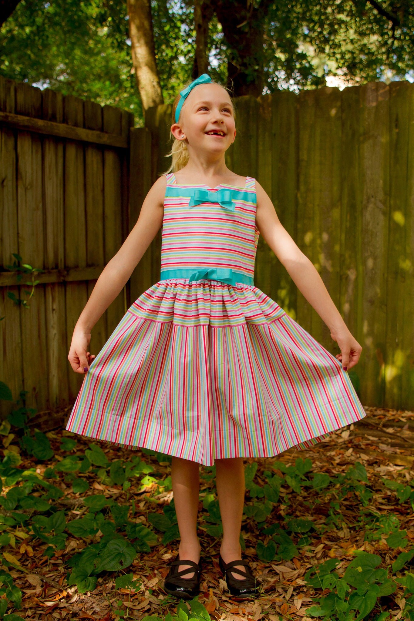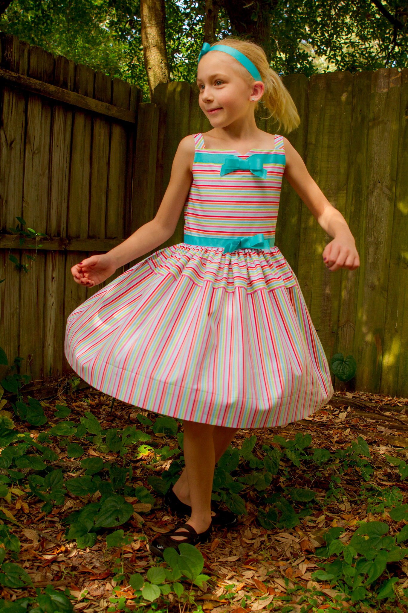 I designed this dress to match the Maryellen doll dress. It's a 1950's style, with a big, swingy skirt and cute colorful stripes. The dress is made of 100% cotton and has a zipper in back. Matching headband included.